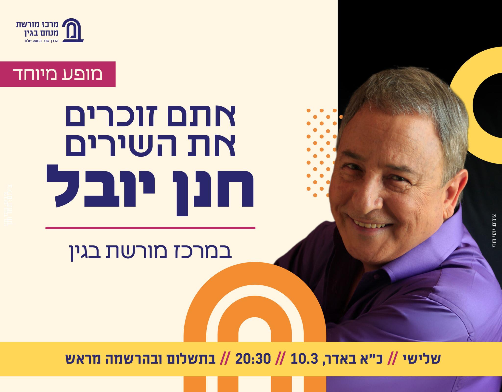 מרכז מורשת בגין מזמין אתכם למופע חגיגי ומיוחד של הזמר והמלחין חנן יובל, אחד מאבני היסוד של הזמר העברי והתרבות הישראלית.