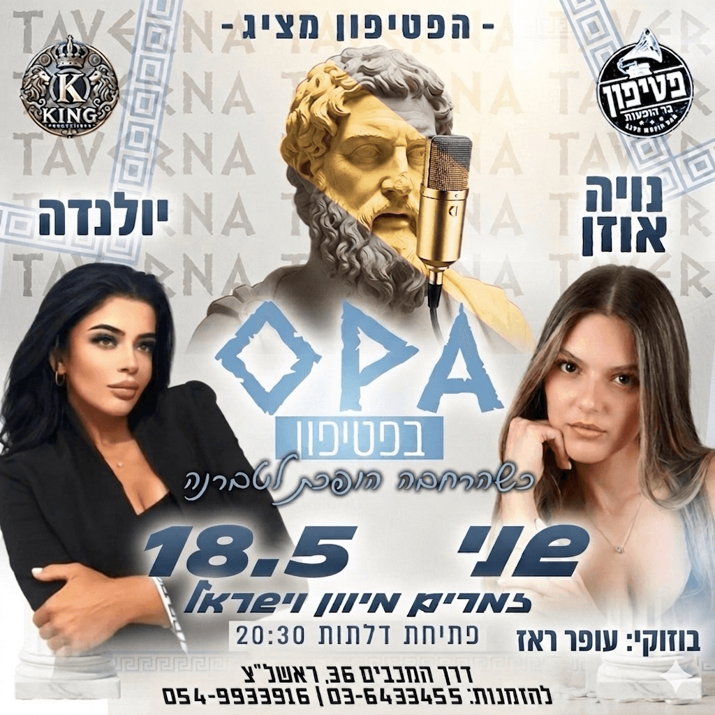 אנחנו מזמינים אתכם למסע של צלילים, טעמים וחגיגה יוונית אמיתית בליין החדש שלנו. בכל ערב נארח את מיטב האמנים מיוון ומישראל, עם הבוזוקי לנשמה והאנרגיה שאי אפשר להסביר במילים.