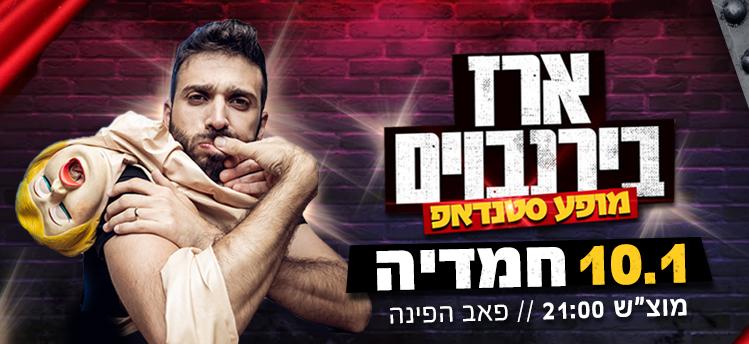 ארז בירנבוים - הסטנדאפיסט היחיד שלא מתאים את עצמו לקהל! המופע של ארז גס, בוטה, בועט ואנרגטי! בלי חוקים ובלי צנזורה... ועם נסיון של למעלה מעשור ואלפי הופעות במועדוני סטנדאפ פאבים ובארים ארז הוא חיית במה. ארז הוא סטנדאפיסט בארים "קלאסי" שיגרום לכם לשפוך את הבירה שלכם יותר מפעם אחת. מומלץ לבוא עם מגבונים לחים למופע.
