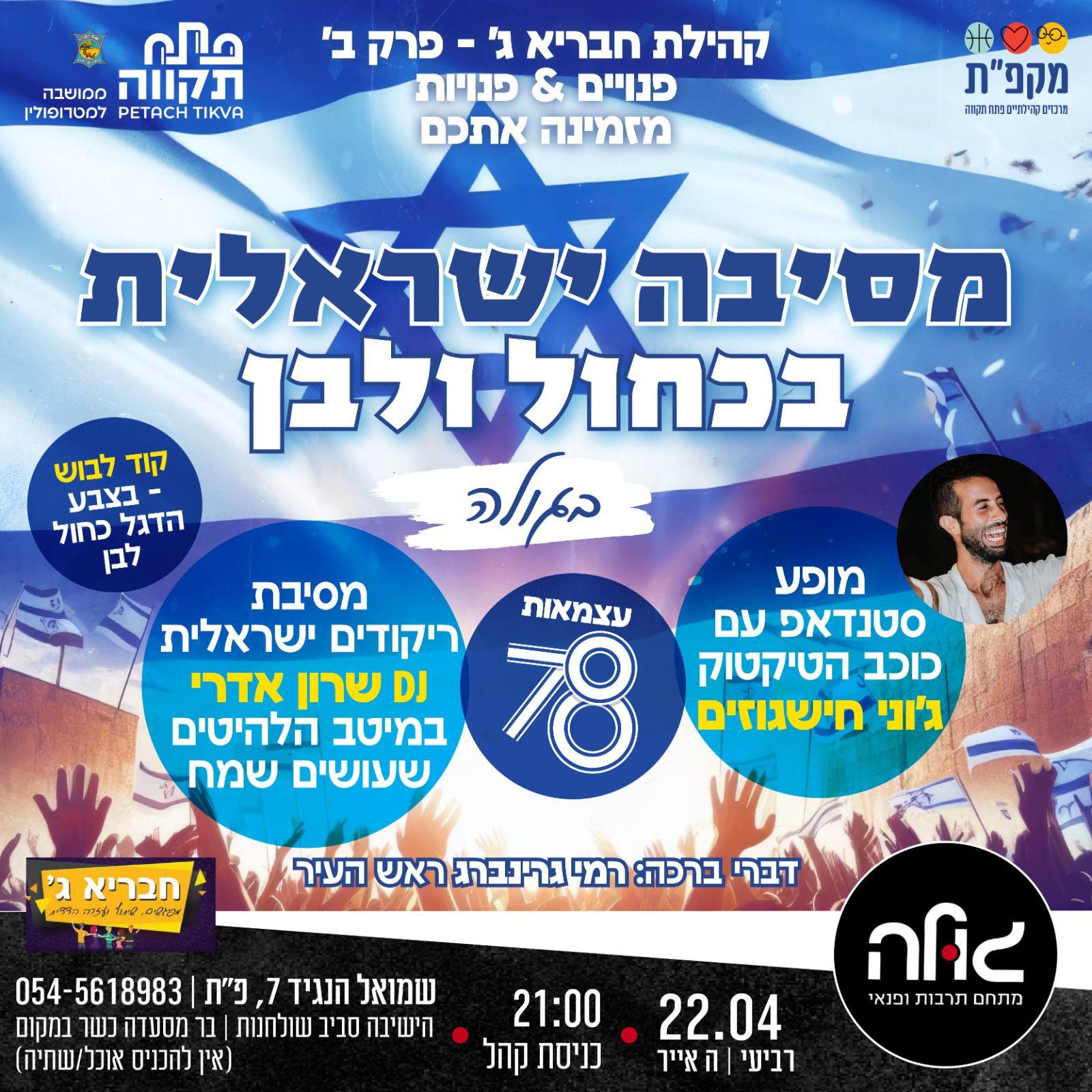 קהילת חבריא ג׳ – לפרק ב׳ פנויים ופנויות מזמינה אתכם לחגיגת יום העצמאות ה78 במועדון הגולה המחודש פתח תקווה