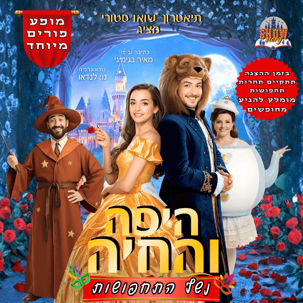והפעם היפה והחיה בהצגת פורים צבעונית, מיוחדת ושמחה, הכוללת נשף תחפושות על הבמה אינטראקציה עם הקהל ותחרות תחפושות לילדים! הילדים מוזמנים להגיע מחופשים, להשתתף בחגיגה וליהנות מחוויה קסומה ושמחה במיוחד.
