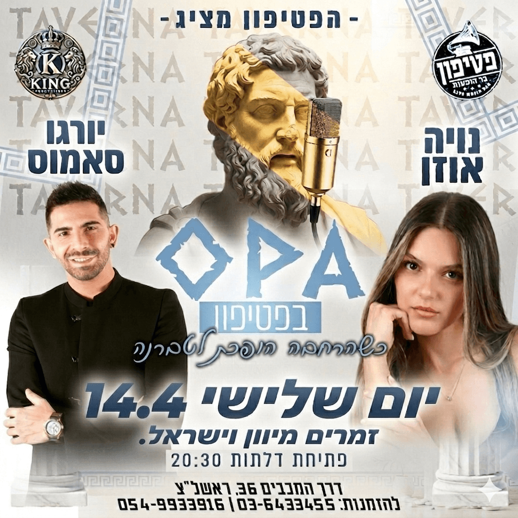 אנחנו מזמינים אתכם למסע של צלילים, טעמים וחגיגה יוונית אמיתית בליין החדש שלנו. בכל ערב נארח את מיטב האמנים מיוון ומישראל, עם הבוזוקי לנשמה והאנרגיה שאי אפשר להסביר במילים.