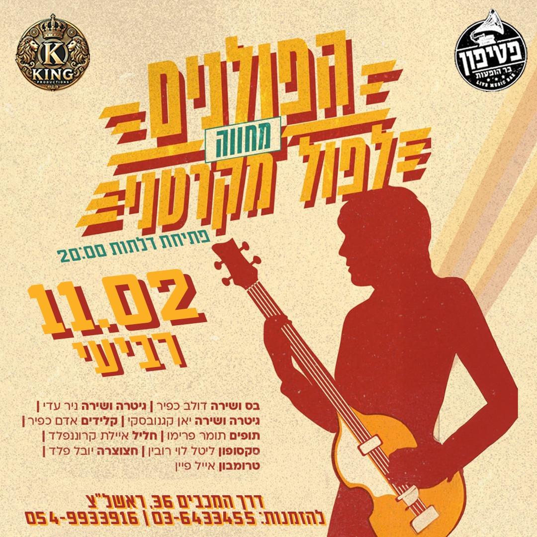 גלו איתנו מחדש את יצירתו של הגדול מכולם, סר פול מקרטני. הרכב גדול וחי של 9 נגנים הכולל כלי נשיפה חיים, גיטרות בועטות ועיבודים קוליים עשירים ישחזרו עבורכם את המיטב מקריירת הסולו הארוכה של יוצר מופלא זה לצד פנינים מתקופת הביטלס. בואו לחוות את הרומנטיקה, הרוקנרול וההרמוניה הקולית המאפיינים את יצירתו של מקרטני ואשר שינו את הפופ והרוק לנצח. לאוהבי מוזיקה בכלל, פופ מכל התקופות, רוק קלאסי וכמובן פול מקרטני.