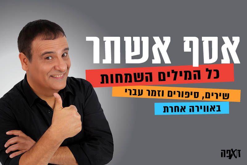 מופע ייחודי ומיוחד של אסף אשתר, חגיגת זמר סוחפת עם סיפורים מאחורי השירים, אנקדוטות מרתקות מחיי היוצרים, שעשועונים וחידונים מוסיקליים... אסף מנצל את כישוריו כשחקן וכבדרן ומשלב אותם בידיעותיו הרבות בזמר העברי, באהבתו הגדולה לשפה העברית ובחיבתו לישראל היפה והטובה. הומור שנוגע ברצינות, רוגע שמתחלף בקצב, ערב מבדר ומפתיע, מחבר ומגבש, מהנה ושמח. והעיקר – שירים, שירים ועוד שירים!