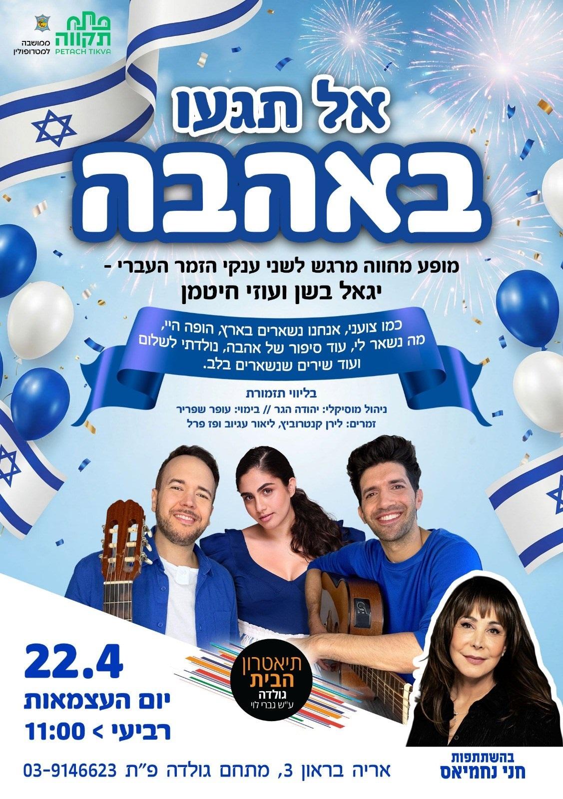 מופע ליום העצמאות "אל תגעו באהבה" בהשתתפות חני נחמיאס 22/4/26 11:00 גולדה פ"ת