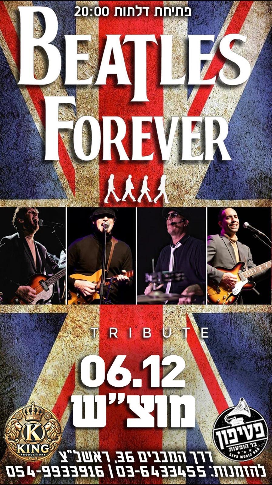 ״ביטלס לנצח״ הוא הרכב מחווה רענן המנגן רפרטואר עשיר ממיטב השירים של הלהקה המיתולוגית בביצועים השומרים על הסאונד, העיבודים וההרמוניות הקוליות שאפיינו את ארבעת המופלאים בדיוק ומוסיקליות שעוד לא נשמעו כמותן בישראל.